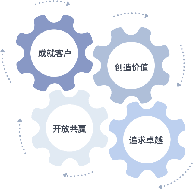 成就客户是一切决策的出发点,,,,创造价值是衡量所有工作的标准,,,追求卓越是我们做事做人的态度,,,,开放共赢是我们的格局也是最终的结果。。价值观的齿轮环环相扣,,,,推动着组织里的每个人不断向前。。。