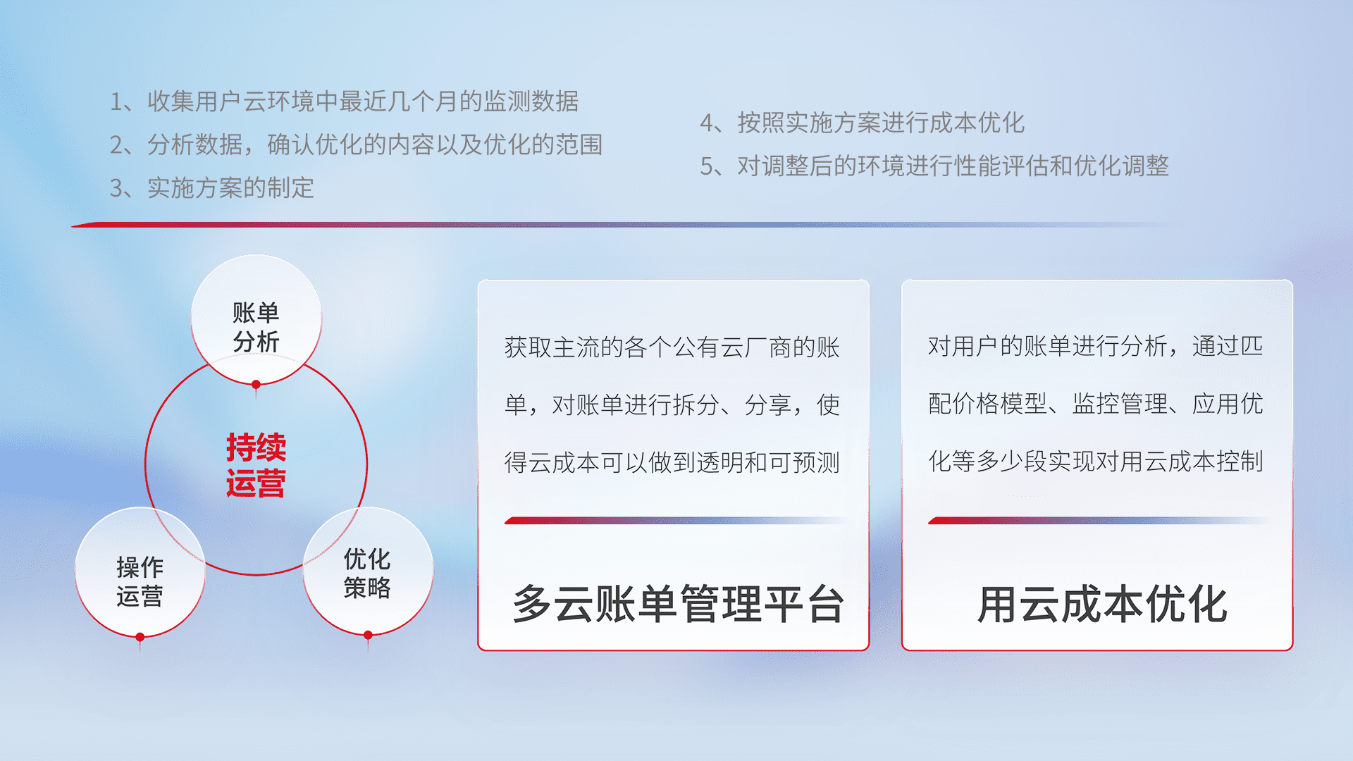 通过多云纳管,,,,以统一的资源数据模型把客户的云资源进行抽象和封装,,,进而实现对多云资源的统一操作,,,,保障云资源管理的可靠性、、、、稳定性与可用性。。。。量身定制化运维内容,,,,配置、、、、开发运维、、、补丁管理、、、、备份、、、、监控、、、、认证和访问管理、、审计和日常巡检等,,,,保障在用云过程中的可靠度,,,,稳定度以及高可用率。。